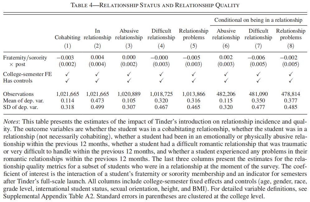 For the second claim, the issue is a bit more complex. Earlier versions of this paper included an analysis on the heterogeneity of Tinder’s impact. Students were split into four quartiles according to their predicted number of partners, calculated using age, gender, race, BMI, sexual orientation, and international student status, with the model trained on pre-Tinder data.