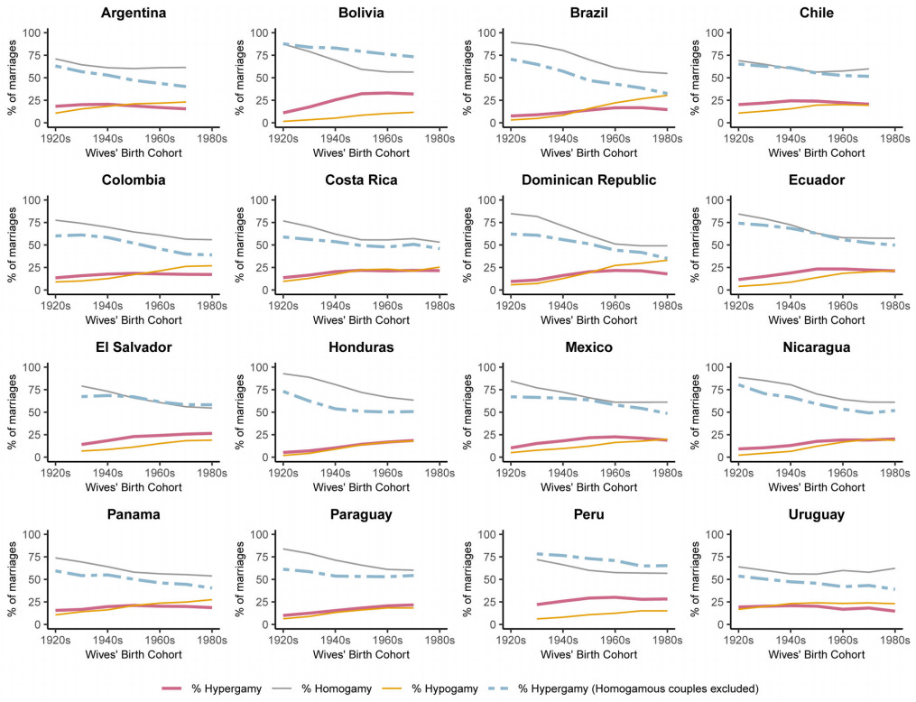 Using census data from across 16 countries in Latin America, they show that when hypergamy is measured relative to all marriages, it has actually increased in most countries over time, while homogamy has declined. However, hypogamy has risen more sharply, suggesting that there are simply more heterogamous unions in general. Part of this may be due to people marrying later, meaning less sorting by education.